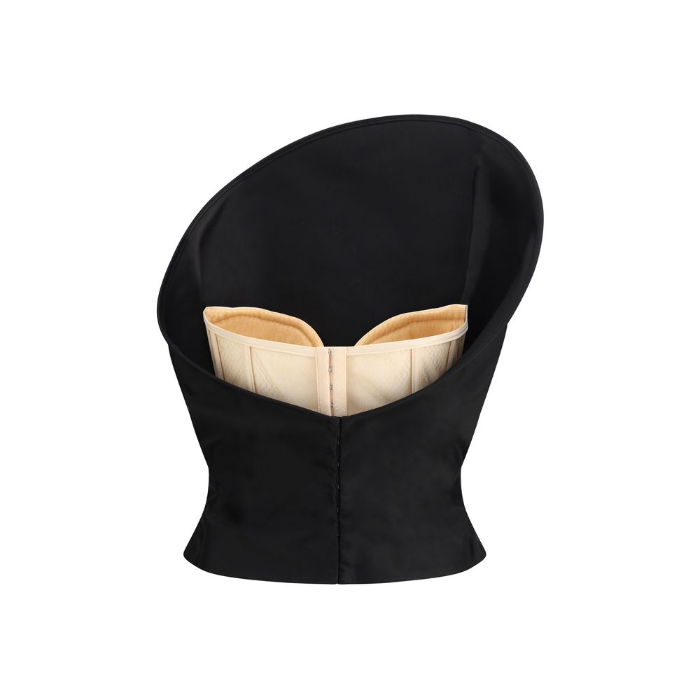 The strapless bustier Top by Magda Butrym blends sophistication with sculptural design. Inspired by the designer’s iconic rose, it features a 3D neckline that shapes the silhouette and rigid cotton construction, creating an elevated and contemporary sleeveless piece.